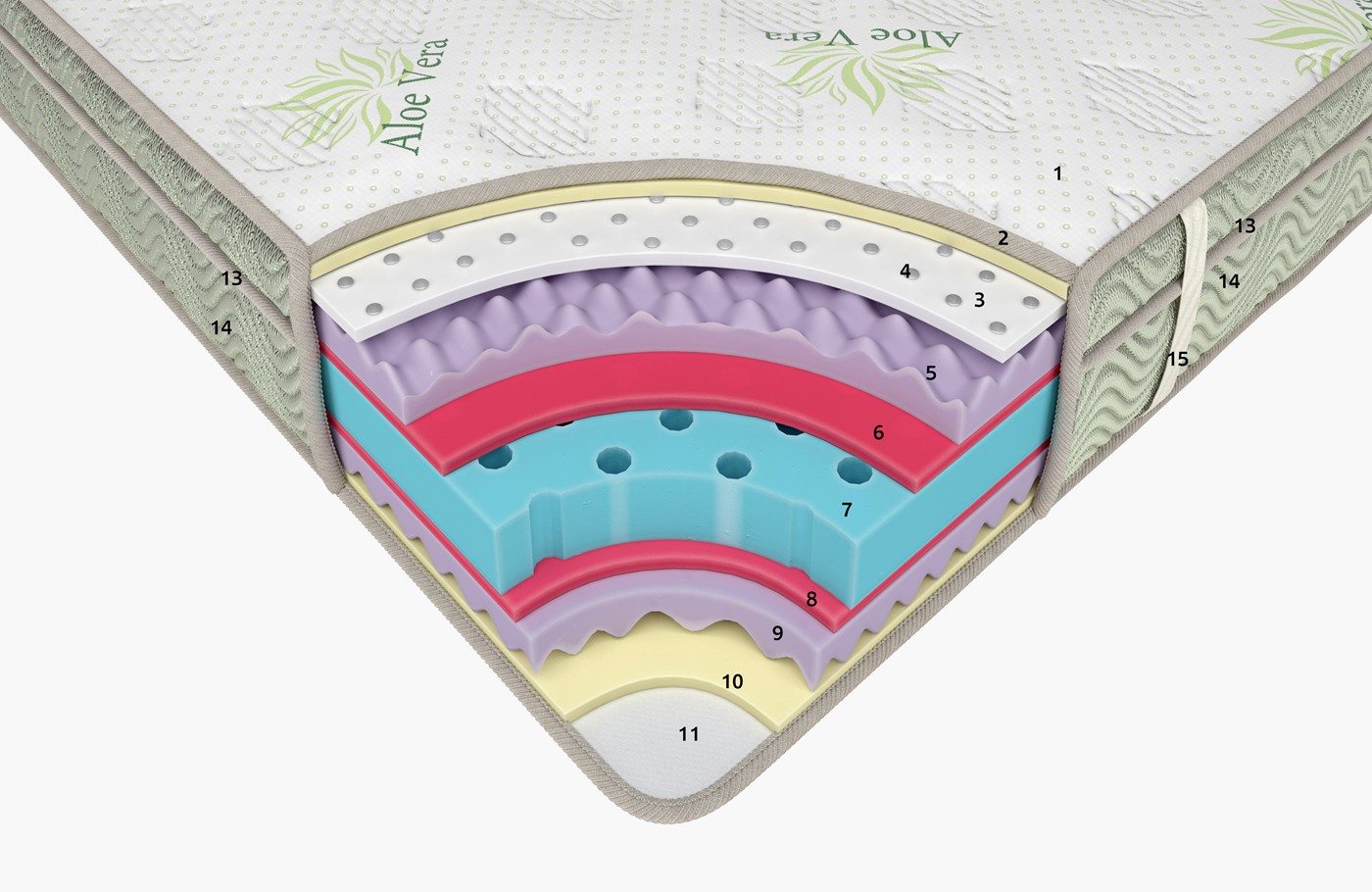 8 A super soft polymer layer, designed, cut and woven in a uniquely healthy fashion, providing 3 areas of support: head, shoulder and pelvis. (Enabling the mattress to be turned around from time to time.)